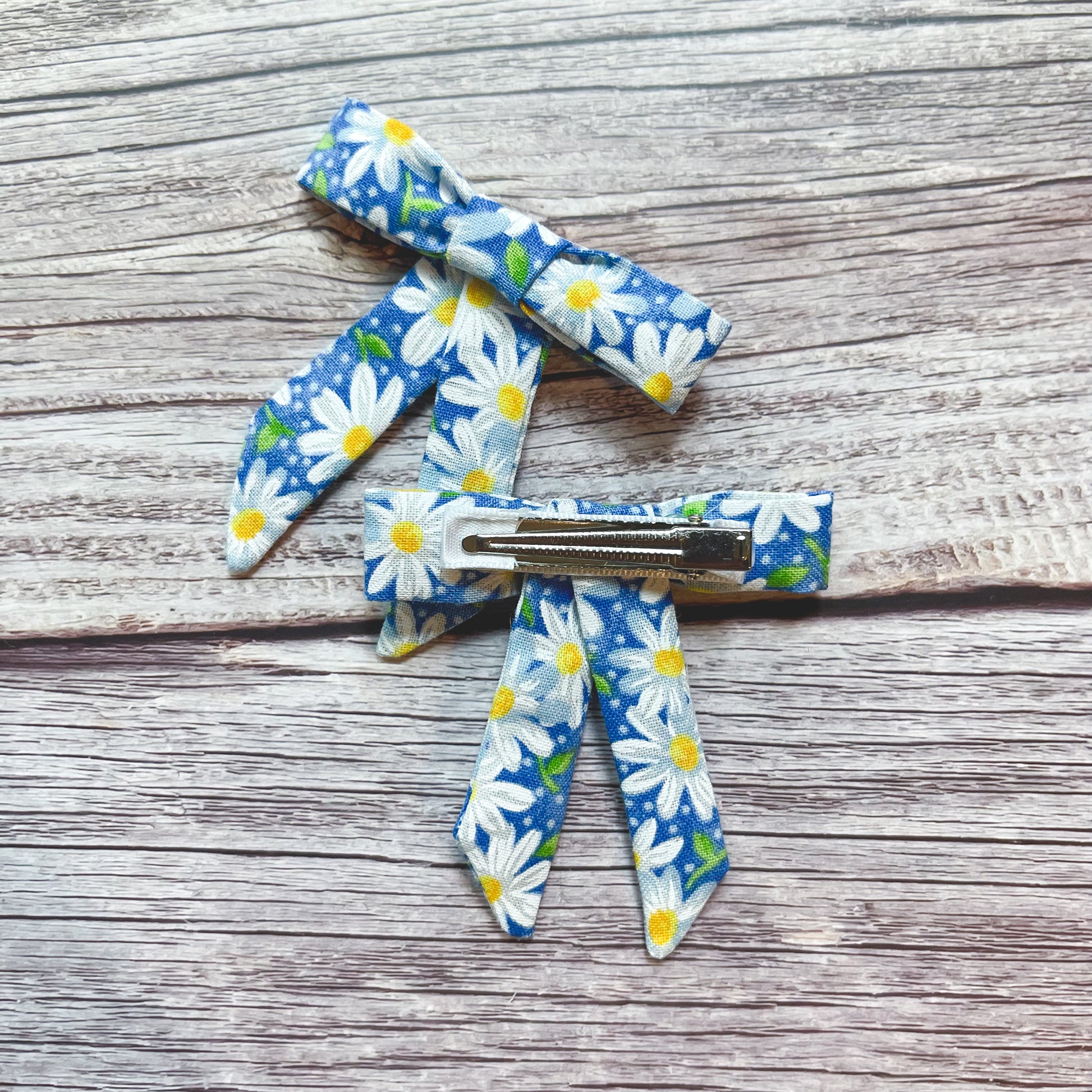 This listing is for a set of 2 clips made from a blue and white daisy floral print.