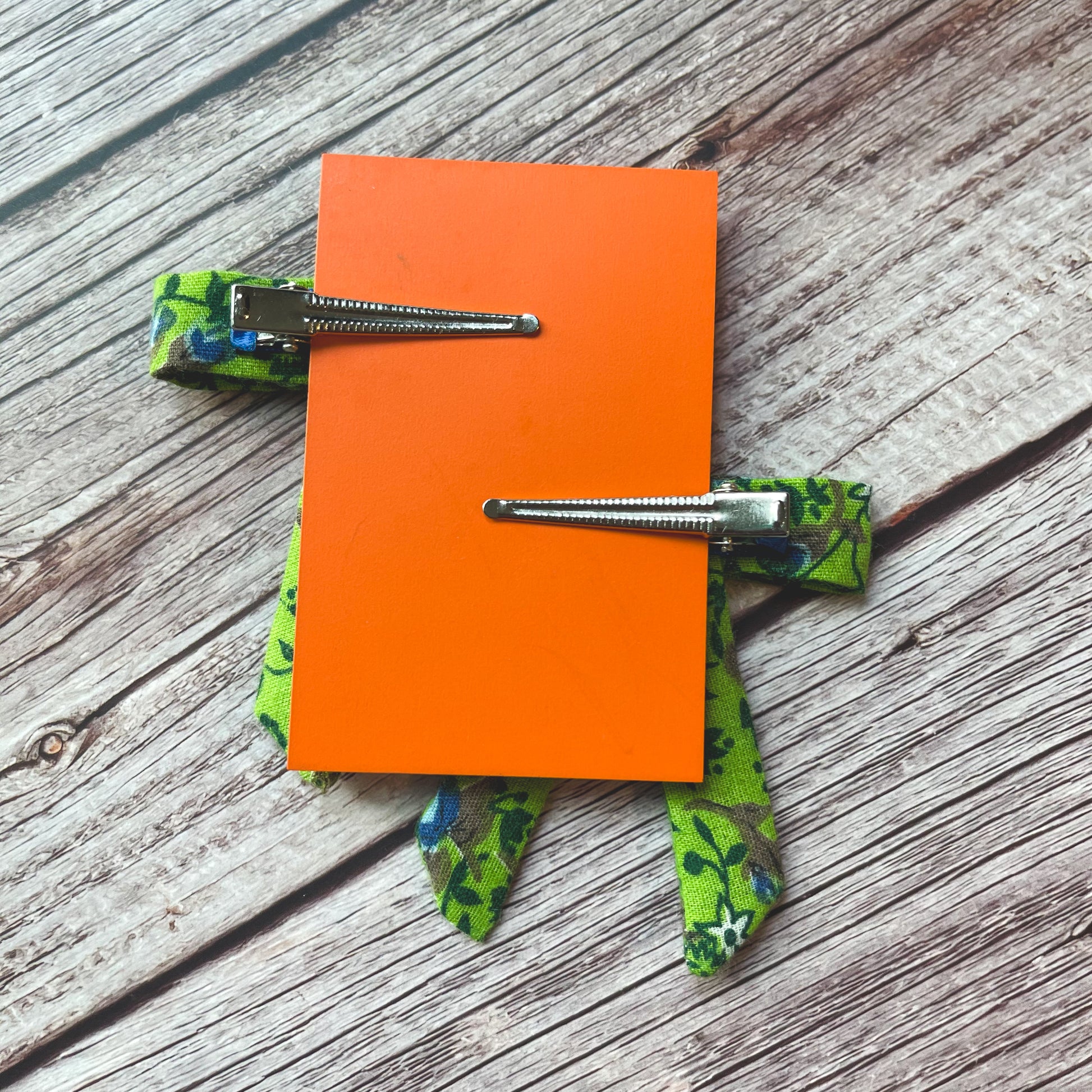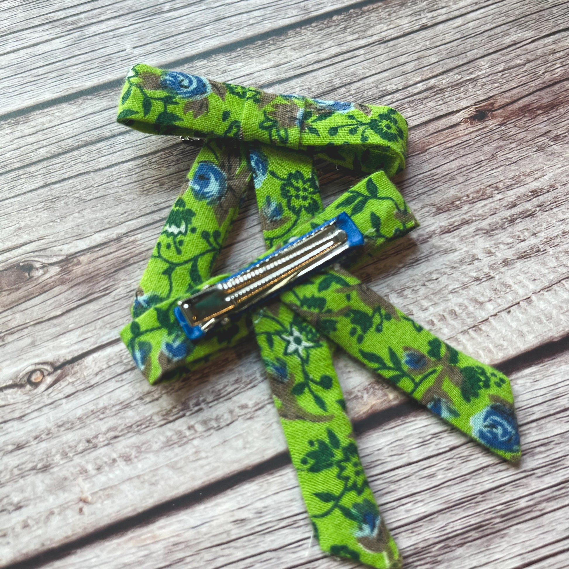 This listing is for a set of 2 clips made from a bright green fabric with a dark green and blue floral print.