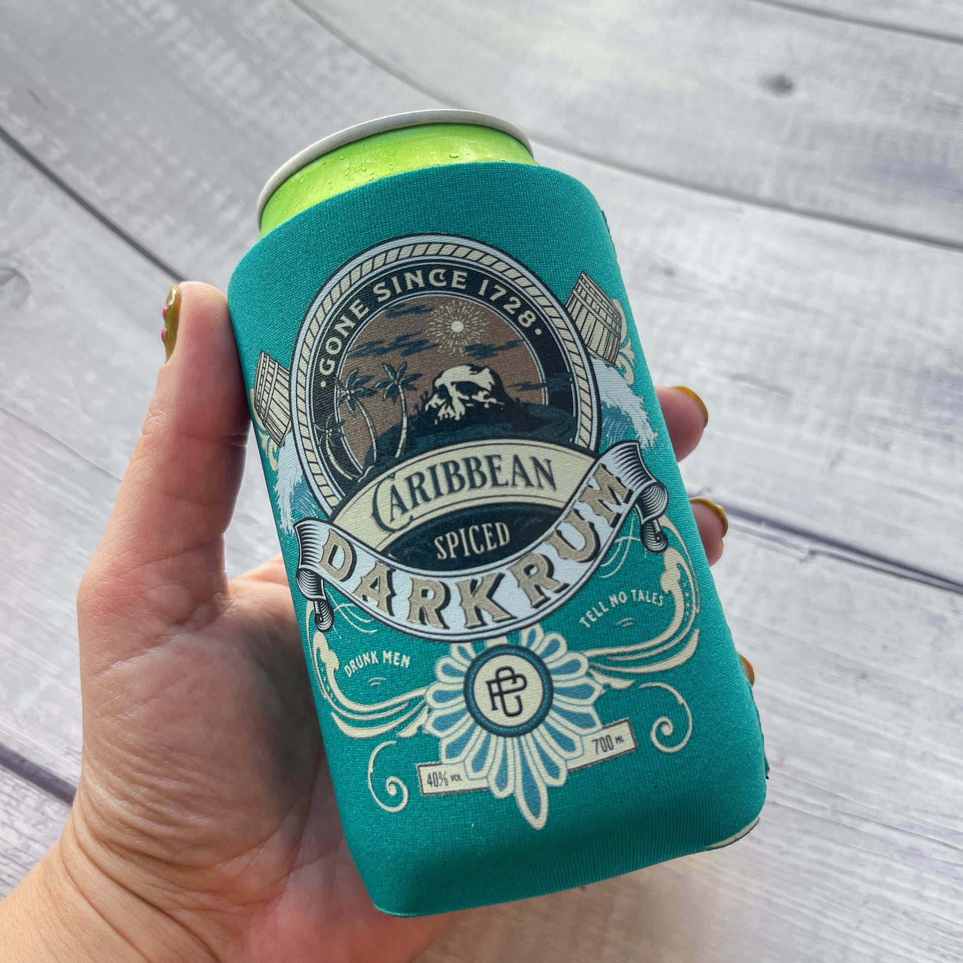 This dark teal sleeve is printed on both sides with a Pirates of the Caribbean inspired rum design.