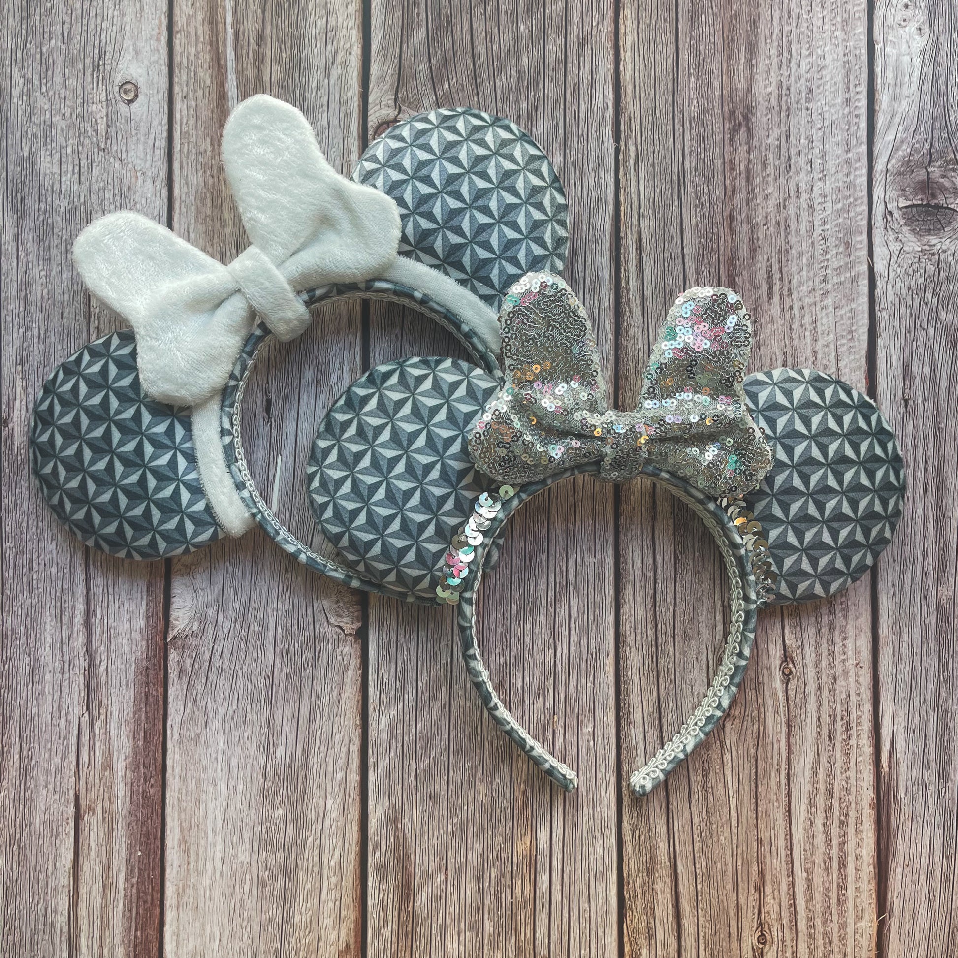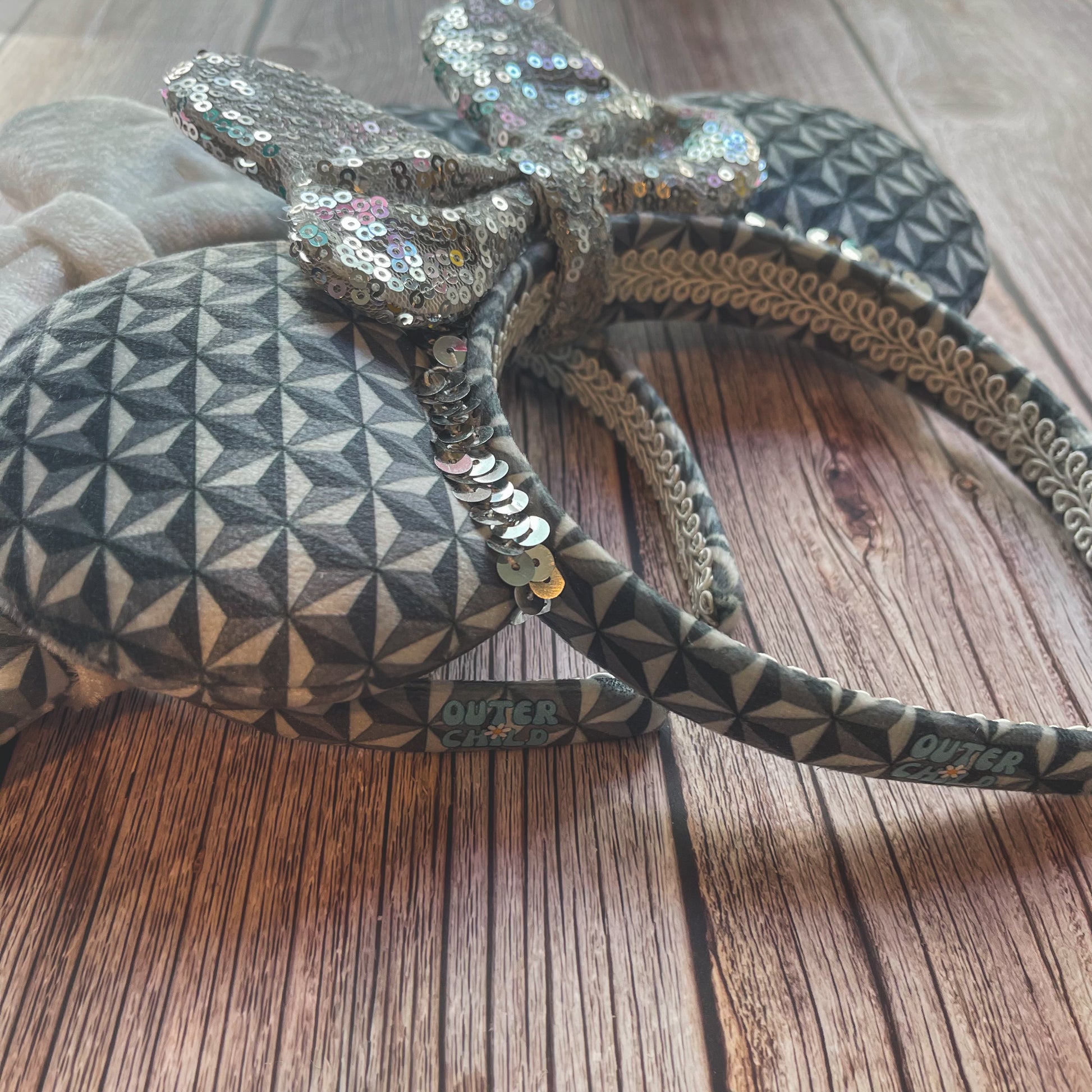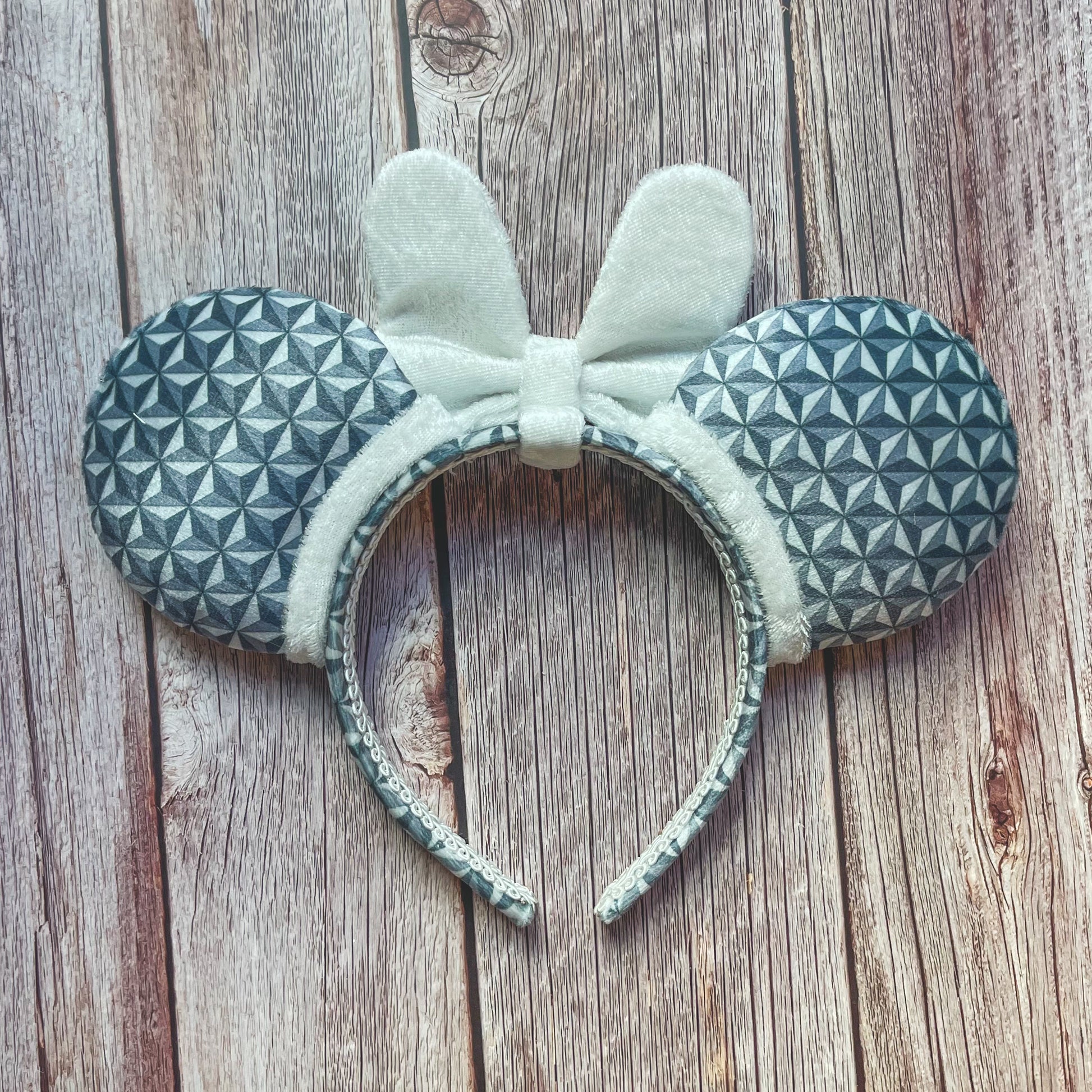 Perfect for Epcot, this full-size pair of mouse ears is made from custom printed rich velvet fabric with a bespoke geodesic pattern!