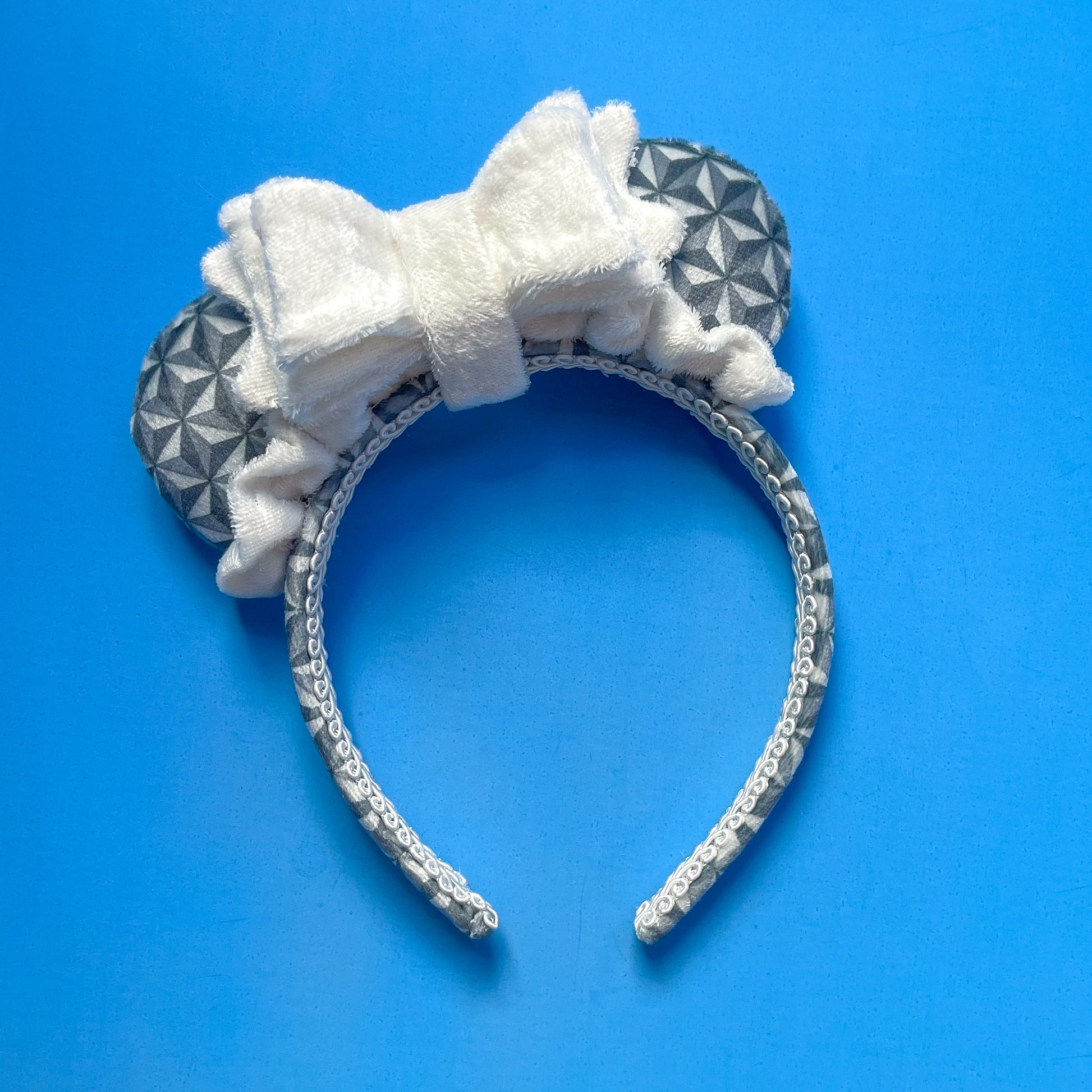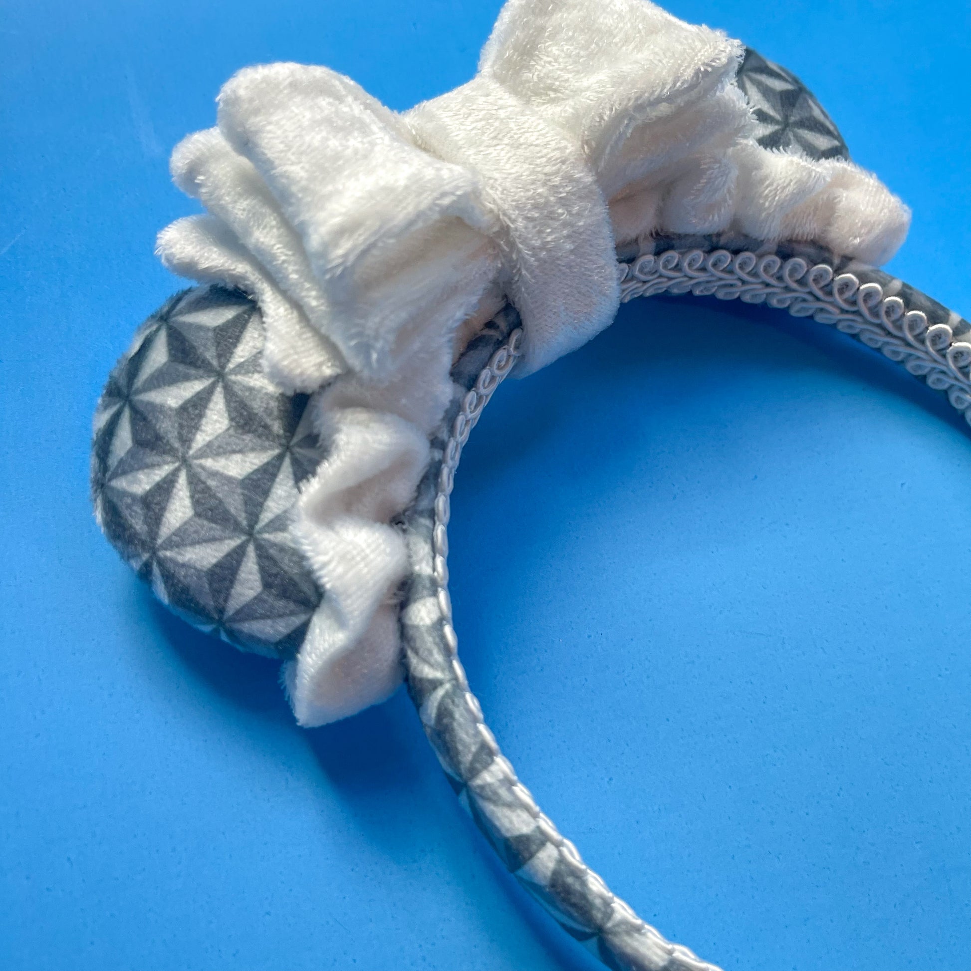 Perfect for Epcot, this mini-size pair of mouse ears is made from custom printed rich velvet fabric with a bespoke geodesic pattern!