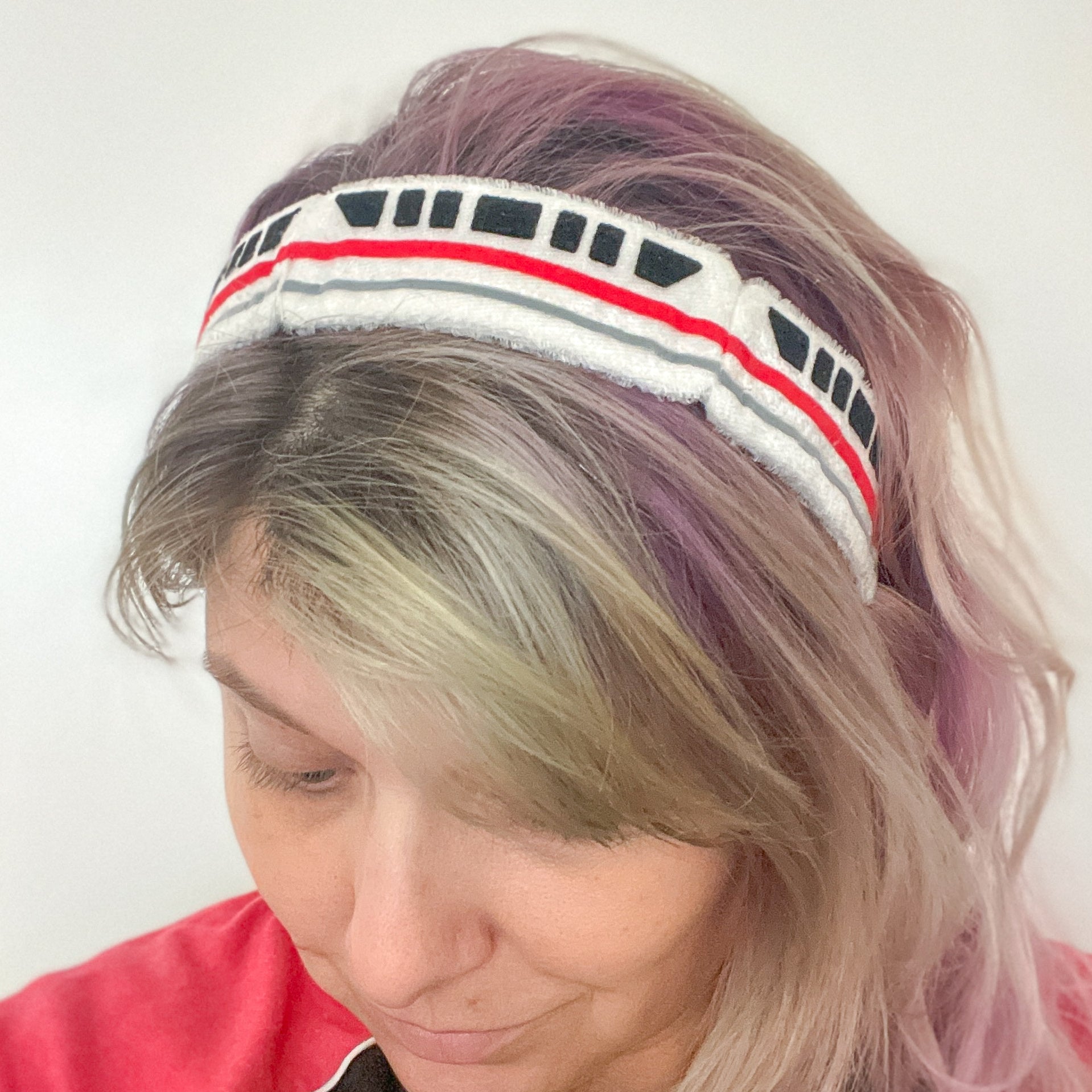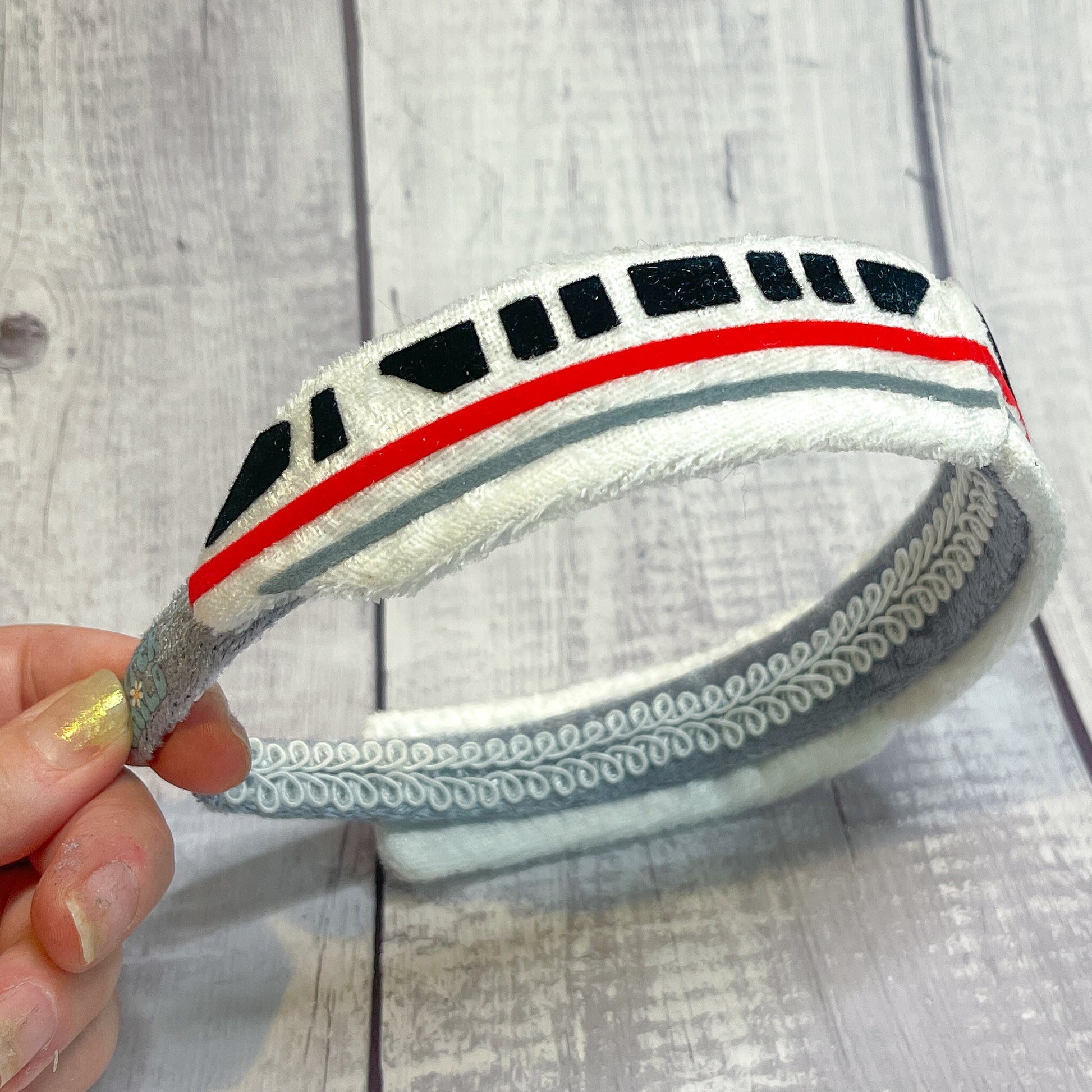 This monorail headband is handmade with plush velvet. It has 3 continuous monorail cars that circle your head. The cars are attached to a silver velvet 1" headband. This headband fits adults and most children 5 and up.Β