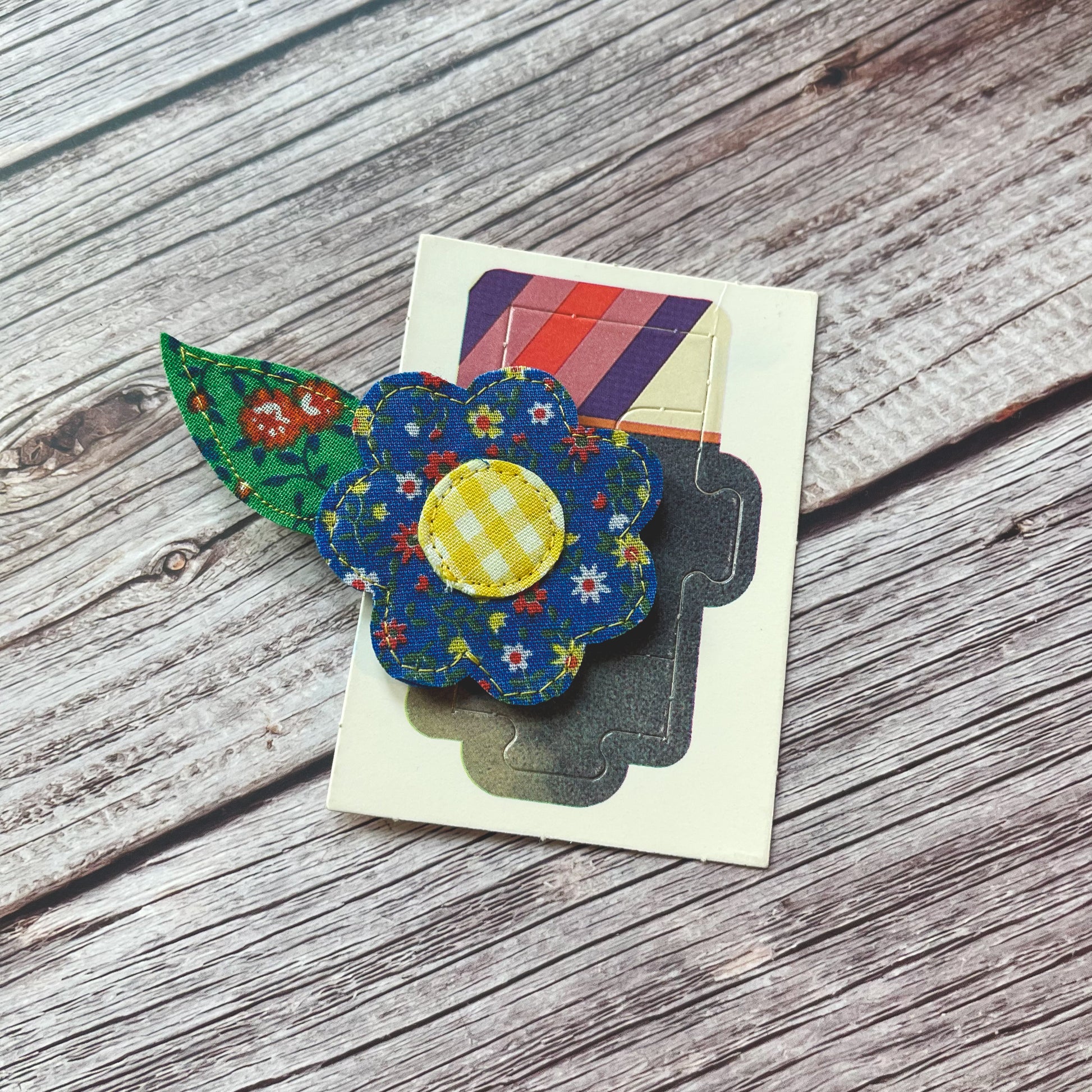 This listing is for one (1) clip made from blue and green ditsy floral prints with yellow gingham checks.