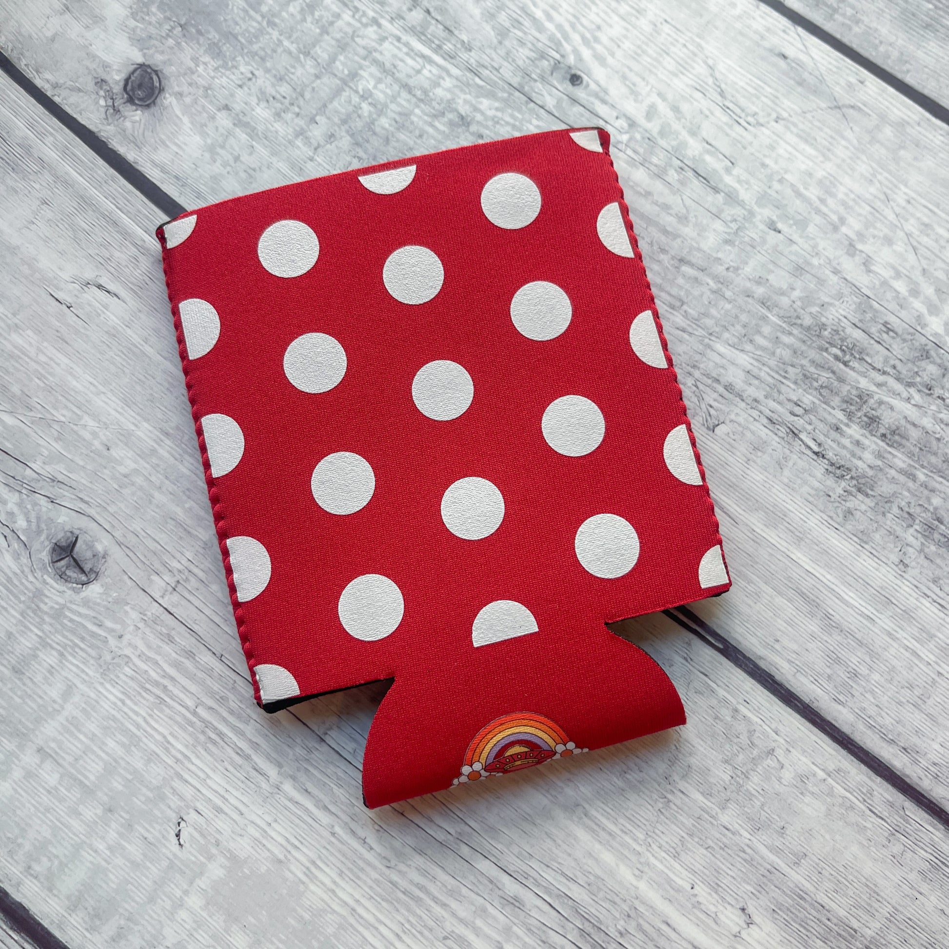 This red can sleeve is printed on both sides with white polka dots.