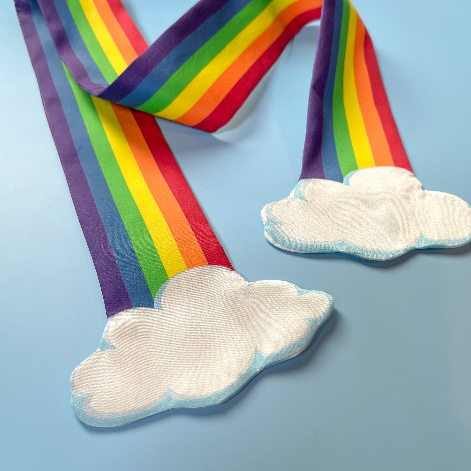 Colors: The main scarf is rainbow with white and blue fluffy cloud details.
