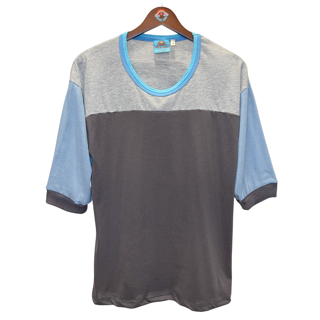 The Underworld Tee is made from lightweight cotton blend with 2x2 cotton jersey ribbing on the collar. This is a 3/4 sleeve crew neck tee. The design is charcoal grey with a light grey yoke. The sleeves are pale blue with charcoal binding. The double binding on the collar is ocean blue and turquoise blue.