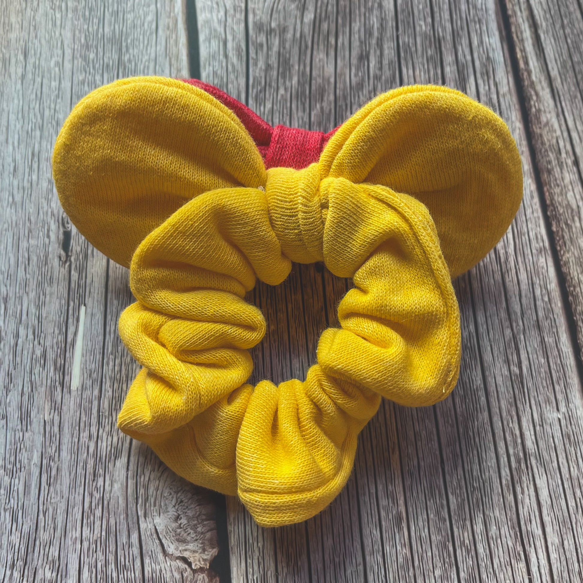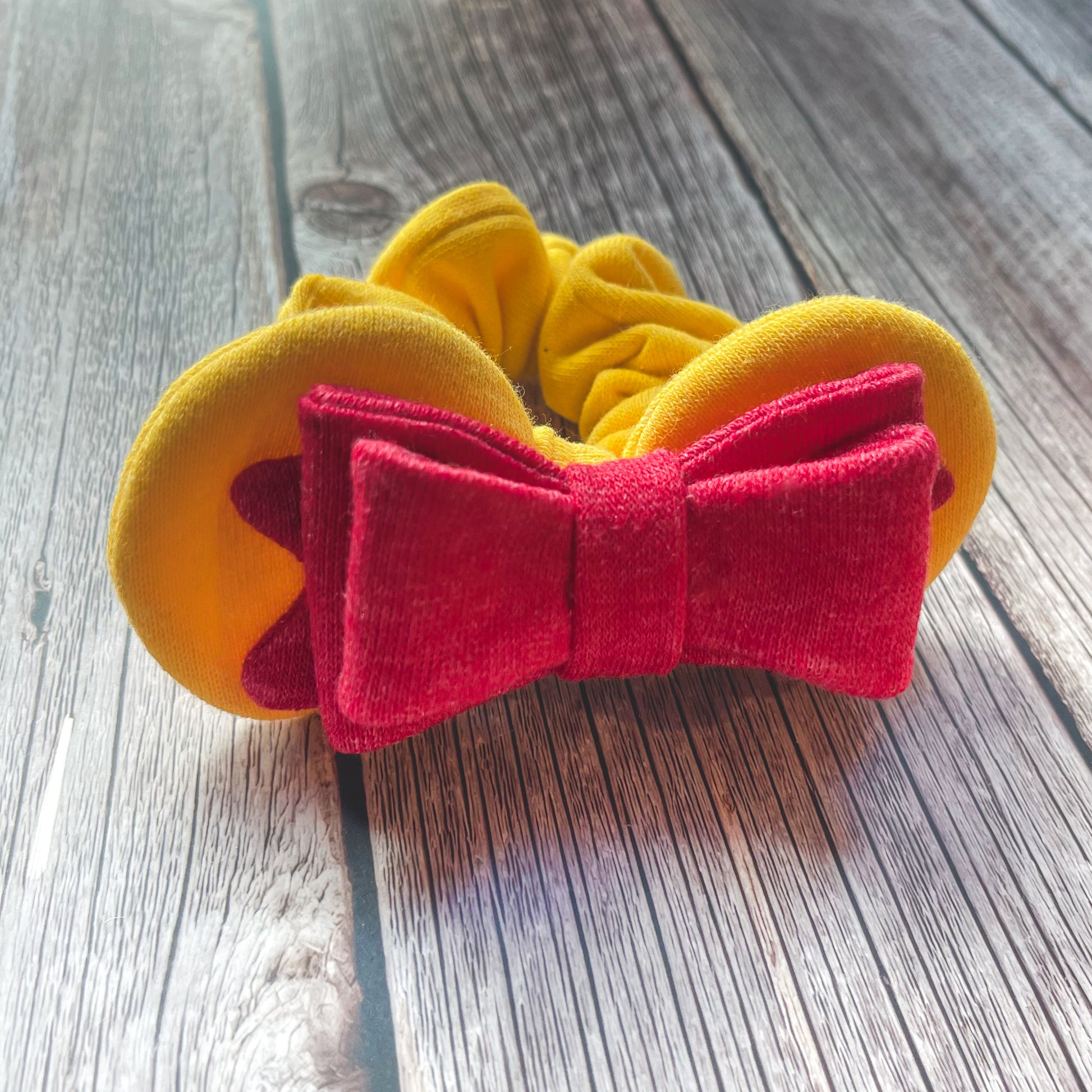 This scrunch is made from soft yellow fleece fabric and my signature triple tier bow in red fleece.
