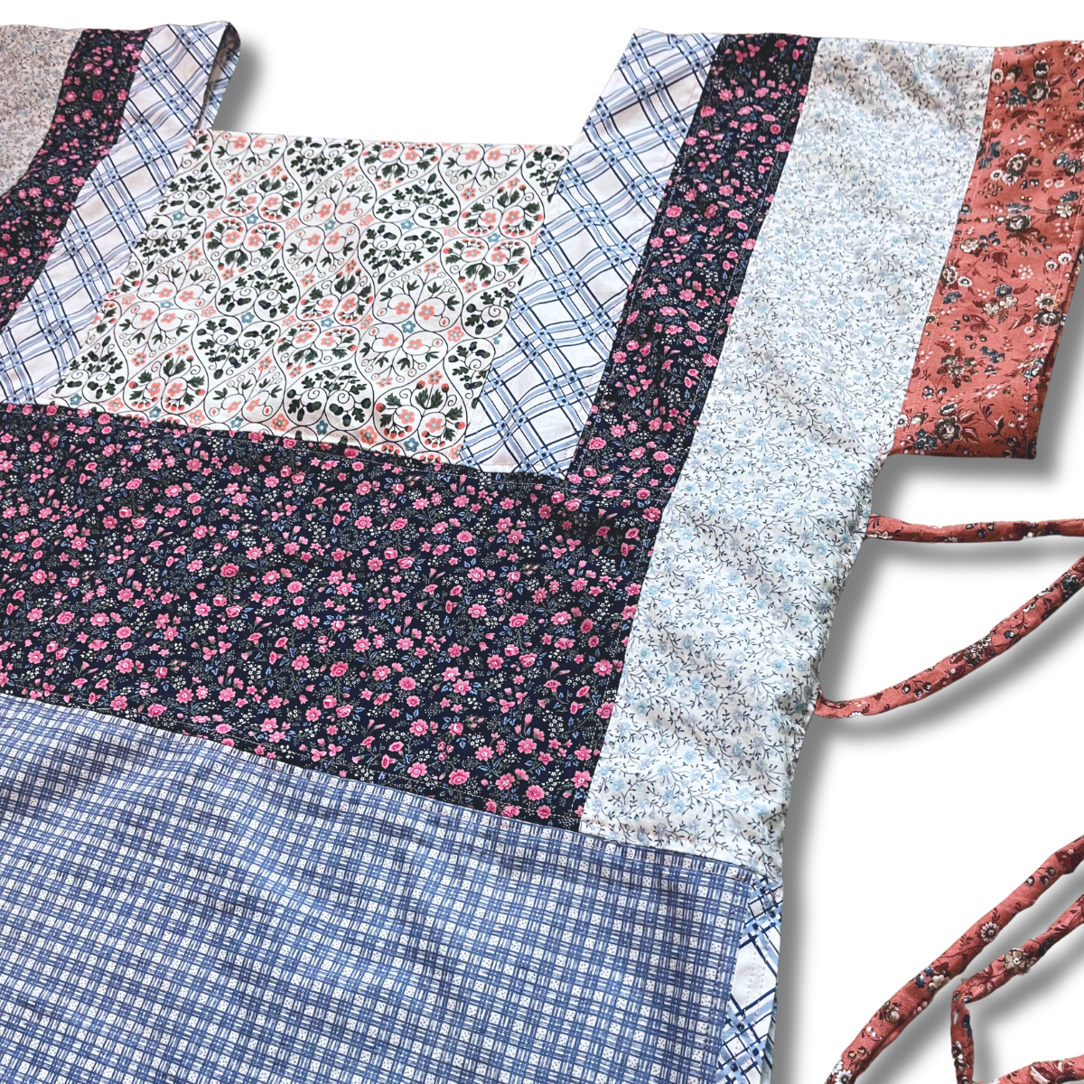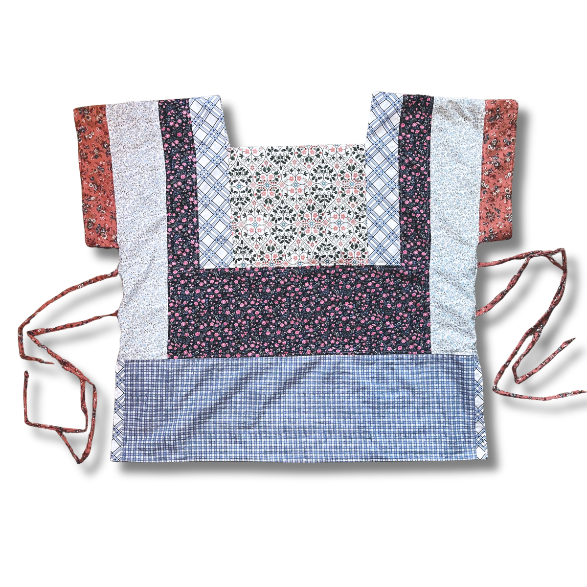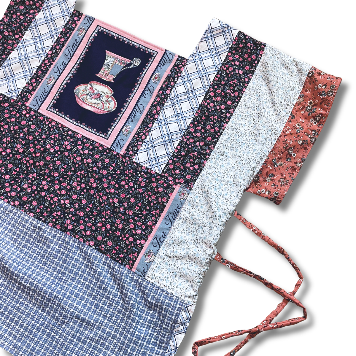 This top is themed from a vintage cut & sew “Tea Time” apron cheater Joan Kessler for Concord Fabrics ca. 1980s. The main panel is surrounded by a patchwork of complimentary floral fabrics in navy blues, bright blues, pinks, and whites.