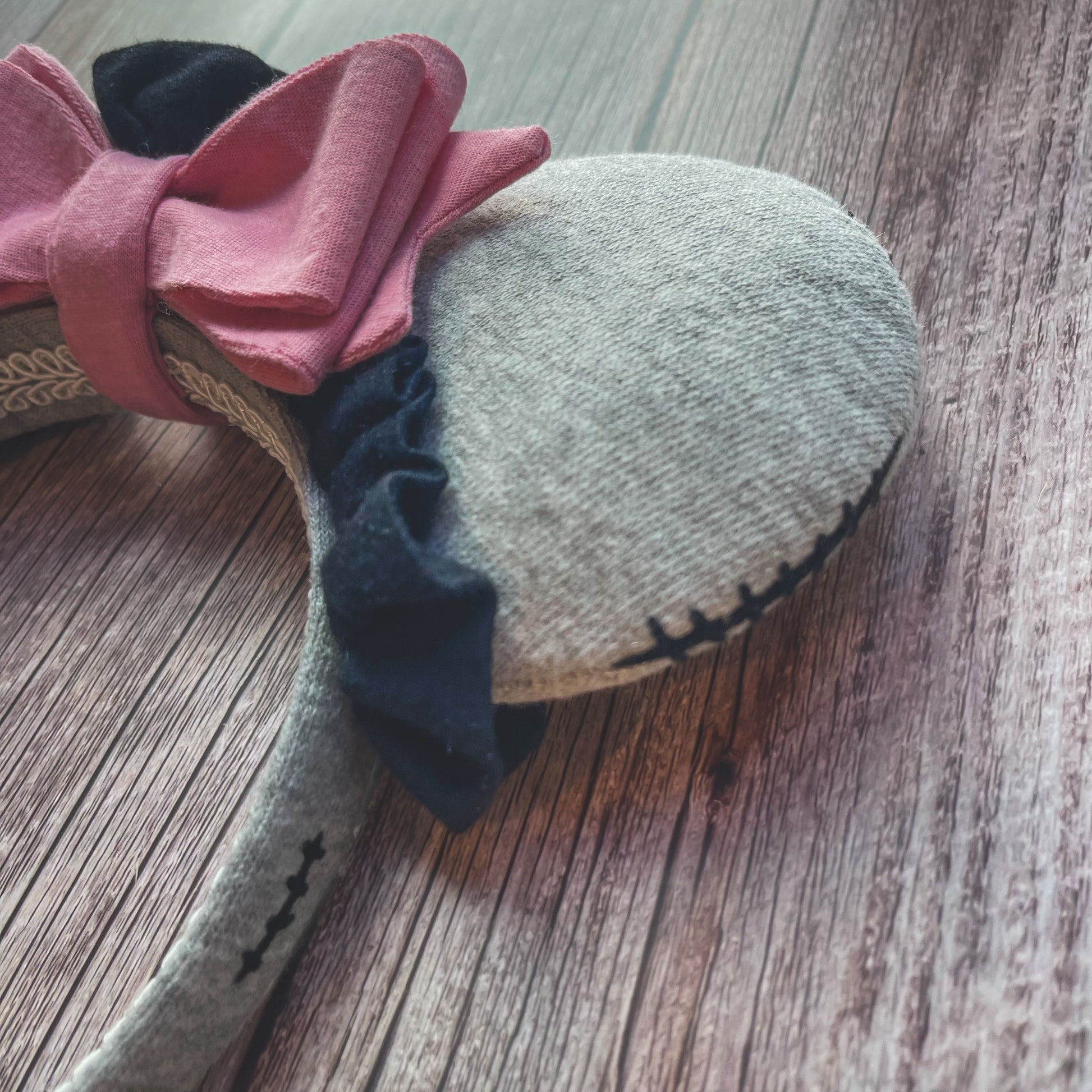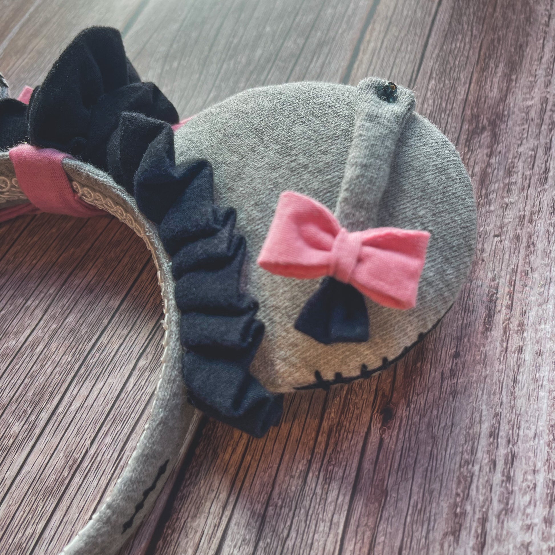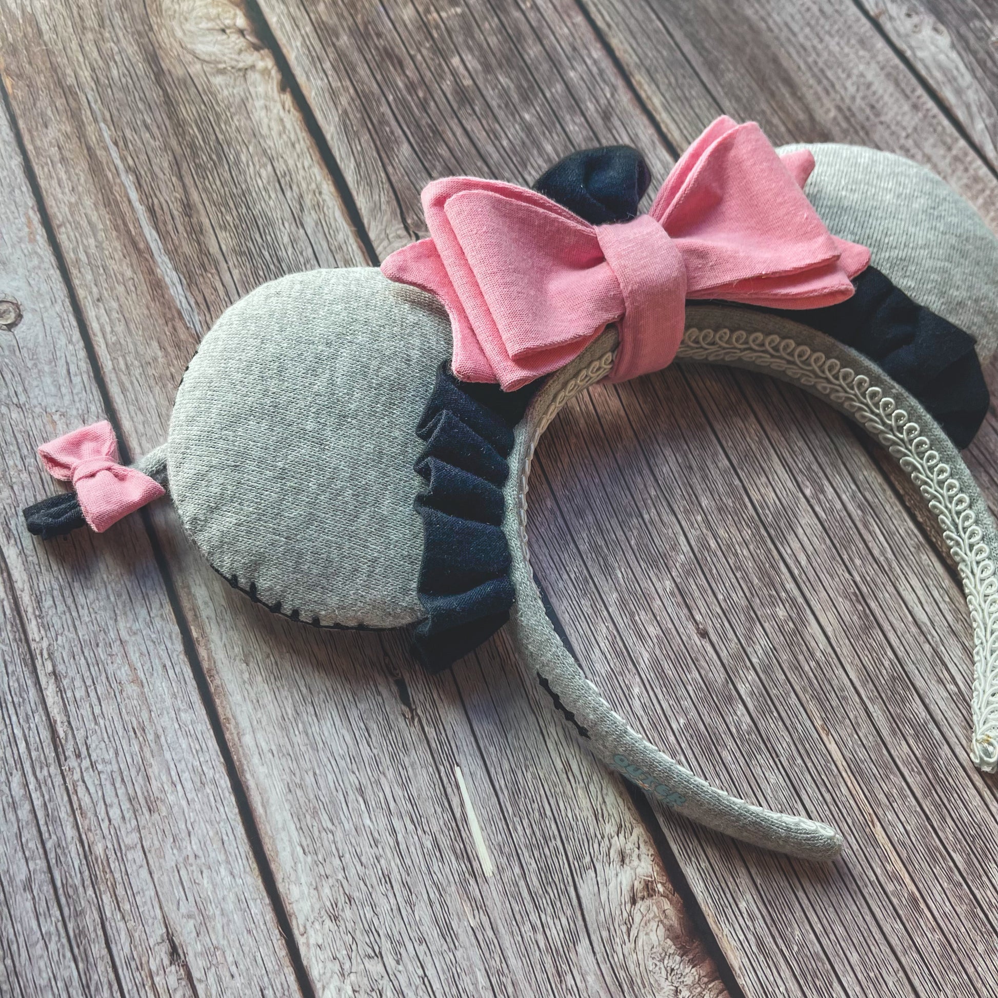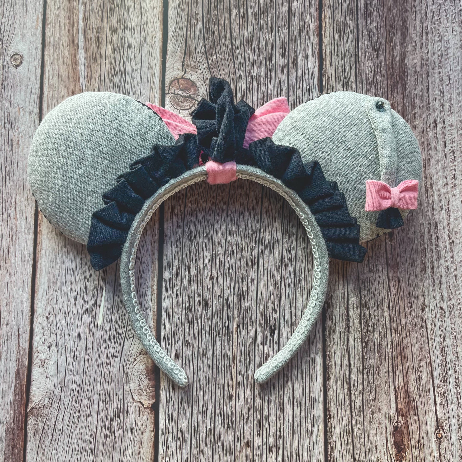 Thanks for noticing these gloomy little donkey ears! Constructed from soft gray fleece fabric, they are trimmed with a handmade black jersey ruffle and my signature triple tier bow in pink. The back features a tail with a sequin pin and a black ruffle mane. The edges have black "stitches".
