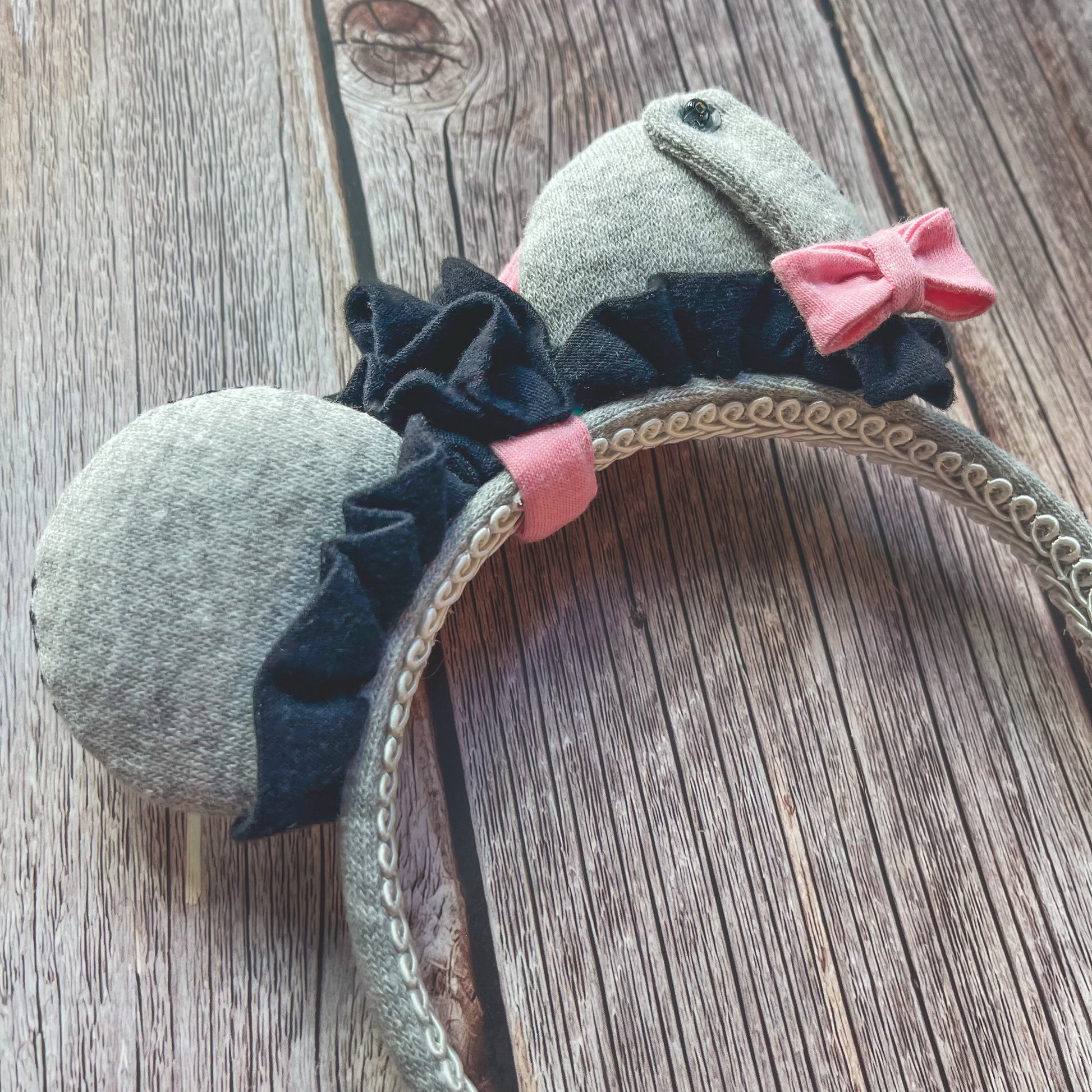 Thanks for noticing these gloomy little donkey ears! Constructed from soft gray fleece fabric, they are trimmed with a handmade black jersey ruffle and my signature triple tier bow in pink. The back features a tail with a sequin pin and a black ruffle mane. The edges have black "stitches".