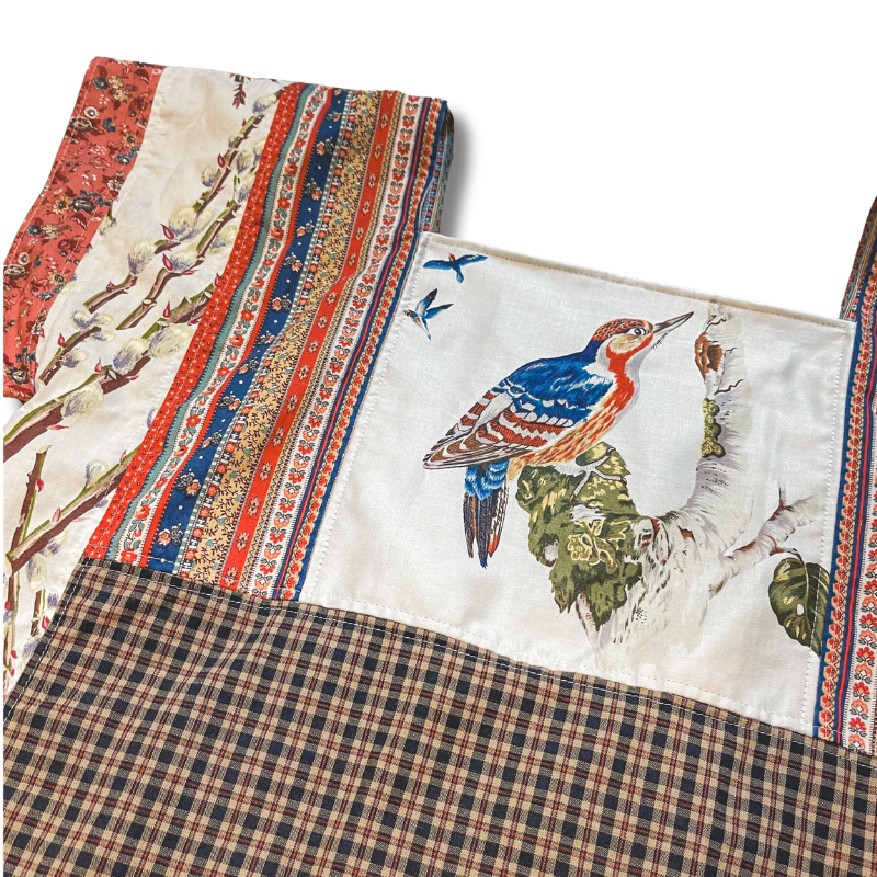 This top is themed from a vintage cut & sew “Woodland Birds” by Pago pillow cheater 1970s or 1980s. The main panel is surrounded by a patchwork of complimentary floral and plaid fabrics in navy blues, whites, creams, reds, and browns.